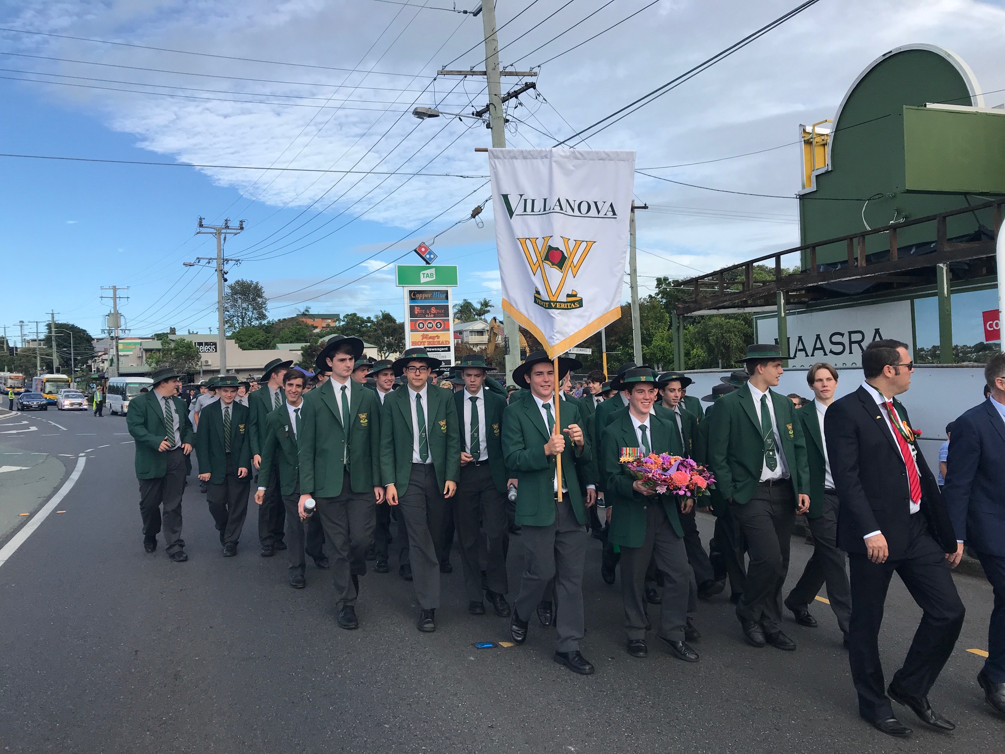 About 60 students and staff formed the Villanova College contingent who marched to Coorparoo RSL for the ANZAC service yesterday morning, where College Captain Matthew Rolls along with Vice Captain Will Barwick laid a beautiful wreath on behalf of the College. It was wonderful to see so many boys of all ages representing the Villanova community. Lt Colonel Andrew Kirby gave the address and spoke of men from Coorparoo who signed up 104 years ago. It made you feel as if you were on holy ground. In particular, he mentioned Captain James Atkinson of Cavendish Road, and Reg Verry, who now has a street named after him. Neither man returned from the Western front and both forwent the opportunity to marry loved ones and have a family. Lest We Forget.